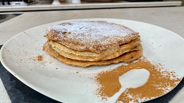 Unite in ultimo la mela. In una padella piccola mettete dell'olio Evo e iniziate a cuocere il composto. Servite con dello sciroppo d'acero o con dello zucchero a velo oppure stratificate della confettura di pere e cannella.