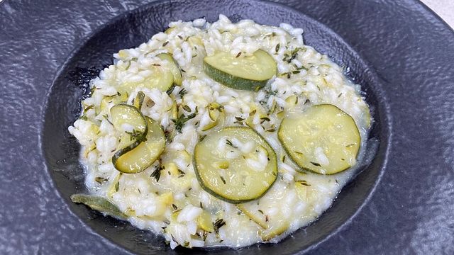 Mettete la scorza di mezzo limone a bollire con un litro e mezzo di acqua. Tagliate a rondelle 300 grammi di zucchine. Con la mandolina tritate lo zenzero, aggiungete lo scalogno e il timo sminuzzato, le zucchine, 200 grammi di riso e mettete tutto in pentola.