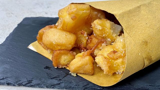 Scaldate bene l'olio di arachidi e friggete. Appena dorata, scolate la frutta e mettetela ad asciugare su carta assorbente. A piacere, spolverizzate dello zucchero.