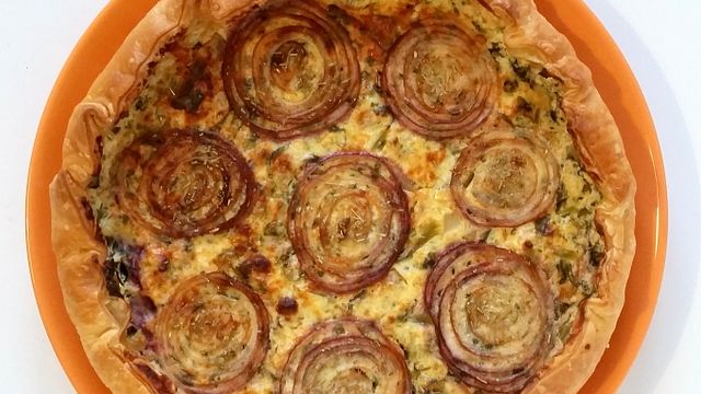 La base è una pasta sfoglia integrale e la farcia è preparata con cavolo rapa e cipolla rossa, pecorino, uova e per insaporire erbe aromatiche e spezie.
