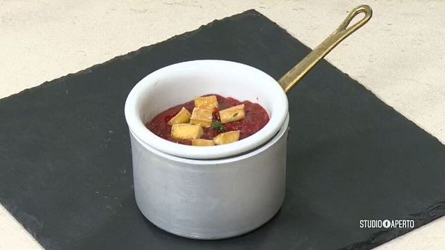 Dopo dieci minuti aggiungete le barbabietole, in quanto già cotte. Tagliate a dadini 100 grammi di tofu affumicato e saltatelo in padella con olio aromatizzato al timo. Lasciate cuocere qualche minuto e salate. Unite gli ingredienti (ad eccezione del tofu) e frullate il tutto. Impiattate con qualche pezzettino di tofu in superficie.