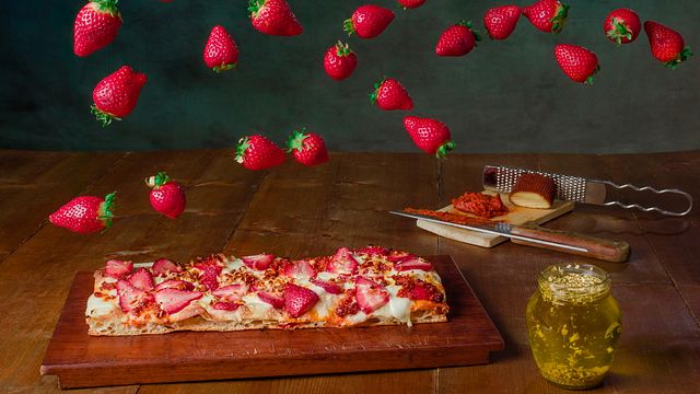 «È una pizza fresca, profumata che riempie il palato per le leggere note aromatiche dei fiori di sambuco». Daniele Campana, artigiano della pizza in teglia di Corigliano Calabro (Cosenza), presenta la pizza inserita in menu dedicata all’arrivo della primavera. «Le fresche note delle fragole richiamano la vita all’aria aperta e i frutti della terra tipici della primavera - spiega Campana - Ho inserito i fiori di sambuco in infusione, di cui il territorio di Corigliano Calabro è ricco, per la delicata fragranza leggermente speziata che contribuisce a dare un sapore fruttato alla pizza in teglia». L’Nduja dona un sapore deciso e riequilibra le consistenze, assieme alla ricotta dura e alla stracciatella. «Sono tutti ingredienti – conclude Campana – che esprimo e raccolgono l’identità della Calabria».
