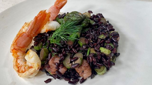 Cuocete 280 grammi di riso venere, pelate 300 grammi di asparagi e mettete la parte dura a cuocere con il riso venere. Tagliate il resto degli asparagi a rondelle e metteteli in padella con olio Evo e scalogno. Pulite 12 gamberi, togliete il carapace lasciando in alcuni la coda e apriteli a farfalla. Gli altri invece puliteli completamente e tagliateli a tocchetti.