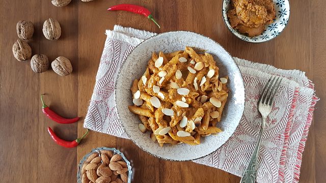 Il pesto di pomodori secchi è un condimento saporito e gustoso, perfetto per preparare una pasta invitante e sfiziosa. I pomodori secchi danno colore e consistenza cremosa e le mandorle donano croccantezza a questo sugo. Si possono usare sia i pomodori secchi sott’olio, già morbidi e non troppo salati, oppure quelli da reidratare in acqua. Il pesto di pomodori secchi si prepara velocemente e si può insaporire in tanti modi. Non necessita di cottura ma solo di un buon frullatore. Io ho aggiunto il basilico che dona profumo e freschezza. Questo sugo donerà alla pasta un tocco mediterraneo che piacerà a tutti i commensali.