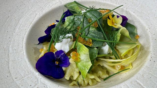 Alla fine della cottura della pasta, unite la parte appena sotto la punta degli asparagi (che non era stata frullata). Scolate la pasta, mettetela in una boule, versate dell'olio Evo, aggiungete qualche goccia di limone, il carpaccio di asparagi, le punte degli asparagi crude, la crema degli asparagi frullati, il kimchi tagliato a coltello, il cuore del radicchietto, il radicchio verde in foglie, la trota e le uova di trota.