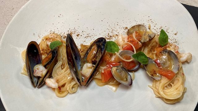 Mettete in padella il pesce, aggiungete qualche pomodorino e il vino bianco. Adagiate i capellini in padella, coprite con poca acqua e mettete il coperchio. Lasciate cuocere per 3 - 4 minuti. Aggiungete un filo di olio di oliva e la polvere di agrumi ottenuta tagliando il limone, il lime e l'arancio a metà, disposti su una placca con l'aggiunta di olio, sale e facendo cuocere per 1 ora a circa 180 gradi.