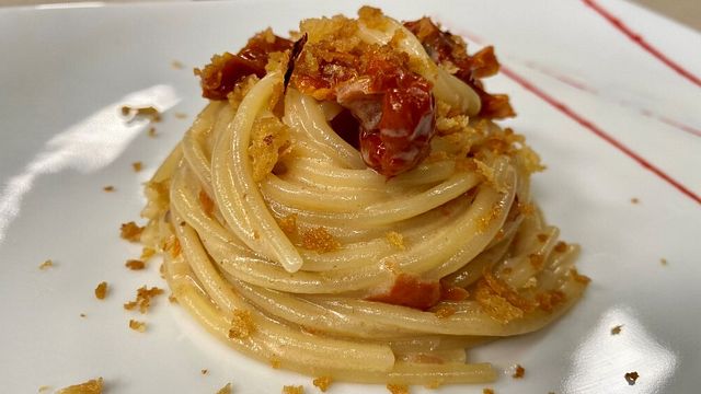 Mettete in padella della mollica di pane tagliata grossolanamente con olio Evo e del peperoncino per renderla piccante e croccante. Una volta scurita, mettetela su carta assorbente. Nel frattempo mettete a cuocere 190 grammi di spaghetti. In un'altra padella scaldate l'olio, rosolate uno spicchio di aglio e fate sciogliere qualche acciuga.