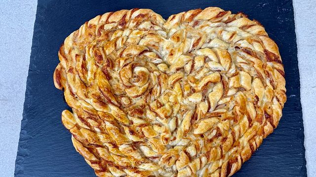 Lasciate riposare in frigorifero 30 minuti o 10 minuti in freezer. Con un coltello tagliate a strisce di uguale larghezza la sfoglia ripiena e modellatele fino a formare un cuore. Spennellate con un rosso d'uovo e infornate a 200 gradi per 15 - 20 minuti.