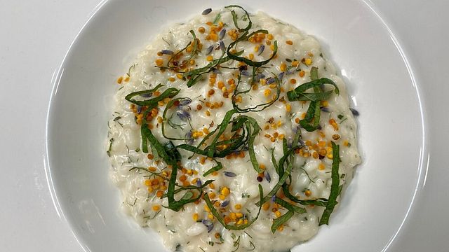 Tagliate sottilmente la melissa e tenetela da parte. Fate un trito molto fine di tutte le altre erbe. Fate a piccoli cubetti il burro e la robiola di Roccaverano. Quando sarà il momento di mantecare unite prima il burro e poi la robiola e se necessario un filo d’olio extravergine di olive taggiasche. Aggiungete per ultime le erbe tagliate fini. Impiattando il risotto cospargete la melissa e il polline di fiori.