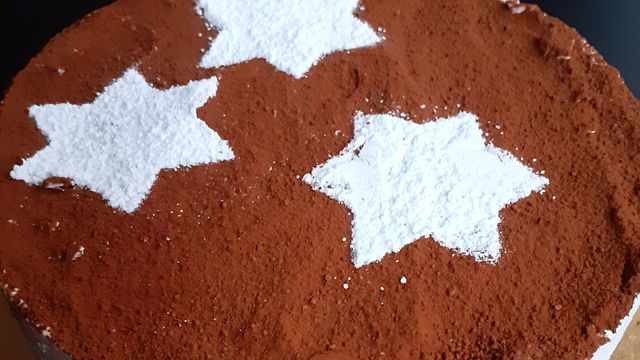 Infine, spolverizziamo con cacao amaro e riponiamo in frigo almeno per due ore. Togliamo la torta dallo stampo e mettiamo su un piatto da portata.