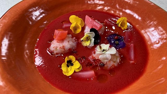 Tagliate i pomodori, il cetriolo, il cipollotto, le fragole e mettete il tutto a marinare con sale e olio. Coprite con pellicola e mettete in frigo. Il giorno dopo frullate tutto. Preparate poi le polpette di gamberi rossi, ginger e paprika. Fate un battuto di gambero. Con l'aiuto della pellicola create delle polpette, poca paprika, aggiungete il ginger e chiudete a sacchettino.