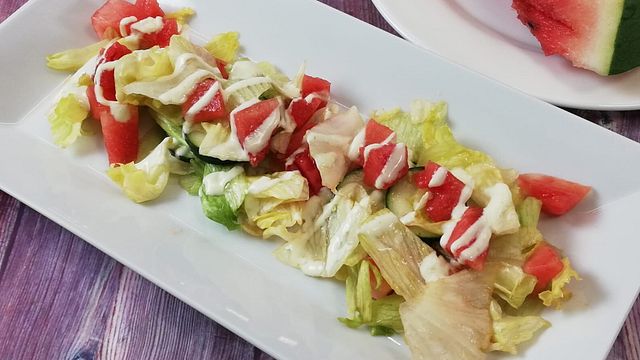 Servite in un piatto mettendo l'insalata alla base e cospargendo in superficie con la salsa allo yogurt.