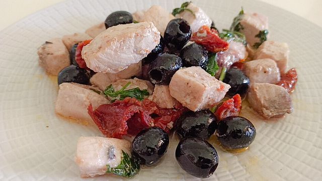 Mettete il pesce in pentola con l'aglio e, dopo aver fatto saltare qualche istante, unite anche i pomodori sott'olio e le olive nere.
