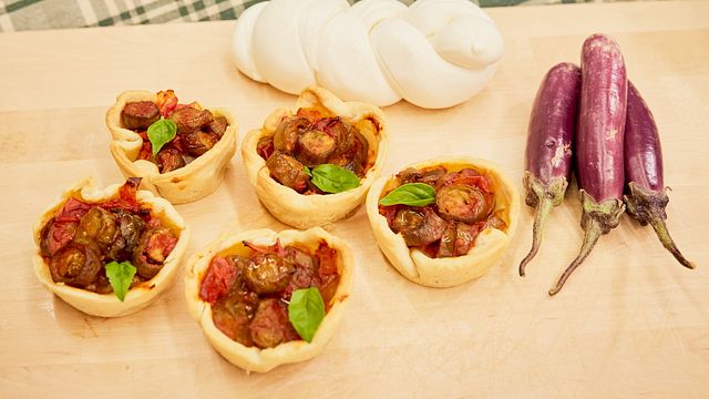 Si tratta di bocconcini sfiziosi in pasta sfoglia ripieni di buonissime melanzane al sugo e formaggio. Si preparano in pochissimo tempo e sono buoni anche il giorno dopo, ideali da portare in ufficio e come aperitivo goloso.