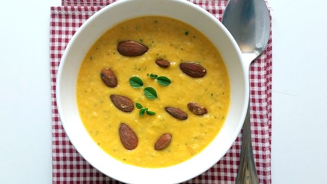 Versate il gazpacho in una ciotola e decorate con le foglie di origano e le mandorle.