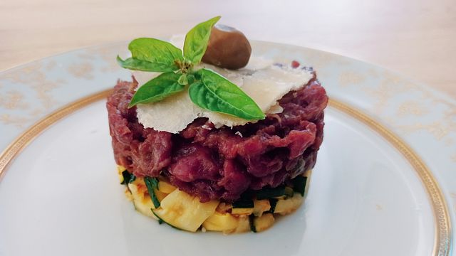 Componete la vostra tartare posizionando alla base le zucchine, aggiungete sopra la carne, le scaglie di formaggio stagionato e infine il basilico per decorare.