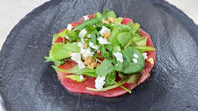 Una volta tolte dal forno, tagliate a carpaccio le fette e impiattate a piacere con della misticanza, della feta sbriciolata e, per aggiungere croccantezza, potete inserire delle noci spezzettate.