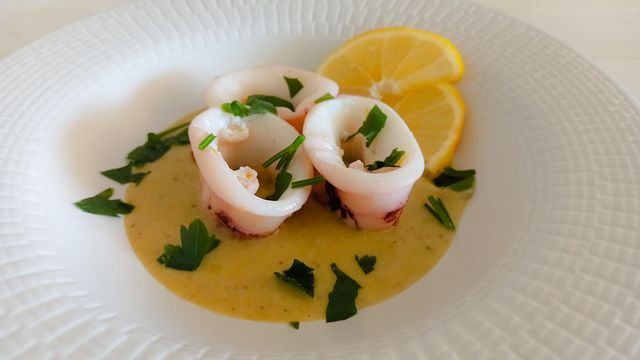 Servite i calamari sulla crema di hummus.