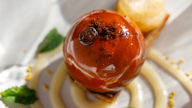 Disegnare nel piatto una spirale con la salsa al cioccolato bianco, mettere al centro un rettangolo di plum-cake e adagiare sopra: da un lato la sfera di caffè e dall’altro una pallina di granita.