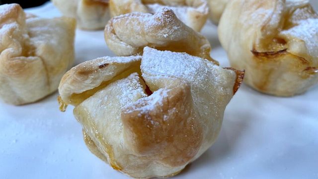Se utilizzate quelli in silicone non c'e bisogno della carta. Sul fondo mettete dello zucchero di canna, la ricotta, della marmellata o confettura a piacere. Chiudete i sacchettini ed infornate 20 - 25 minuti a 180 gradi. Fate raffreddare e spolverizzate con zucchero a velo.