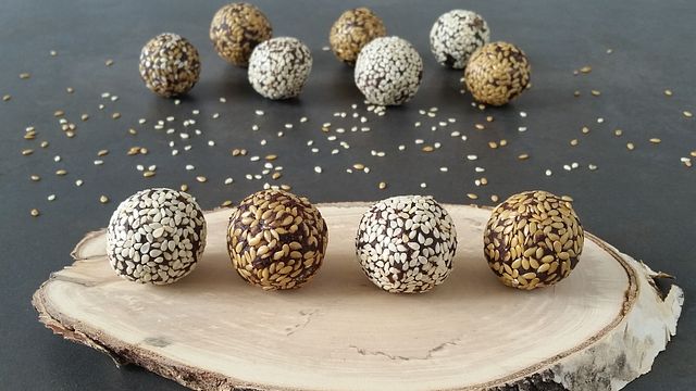 Create delle palline e passatele sopra i semi di lino ed i semi di sesamo.