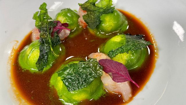 In una padella riscaldare un po’di salsa salsa friarielli unire i bottoni precedentemente sbollentati e lasciare insaporire. In un piatto fondo porre i bottoni di pasta , i gamberi rossi interi oppure ridotti a tartare formando una quenelle, i friarielli ed irrorare con la salsa di crostacei. Decorare a piacere con cimette di erbe e fiori eduli.