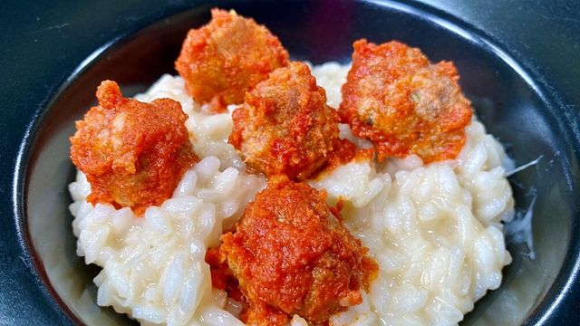Per il risotto tritate e rosolate la cipolla in olio Evo. Una volta appassita tostate il riso, 360 grammi per 4 persone. Sfumate con vino bianco e allungate con brodo vegetale. Mantecate a fuoco spento con 150 grammi di formaggio grattugiato. Impiattate aggiungendo le polpette al sugo.