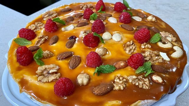 Preparate la crema montando 250 ml di panna, lavorate conla frusta 250 grammi di mascarpone insieme a 2 cucchiaini di zucchero a velo. Unite i 2 composti, stendete sulla cheesecake e fate riposare in frigo ancora 30 minuti. In ultimo versate il caramello e riponete in frigorifero per qualche minuto in modo che solidifichi. Distribuite qualche lampone e foglia di menta come decorazione finale.