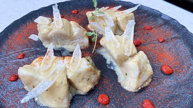 Porzionare a circa 60 gr ciascuno il cilindro di lucioperca. Intingerlo da un solo lato nell’amido di riso e rosolarlo in pentola antiaderente. Passare qualche secondo in salamandra, glassarlo con il beurre blanc alle erbe e rivestirlo di cialde di licoli. Porlo al centro del piatto precedentemente ricoperto di polvere di pomodoro. Accompagnarlo con l’emulsione di pomodoro confit.
