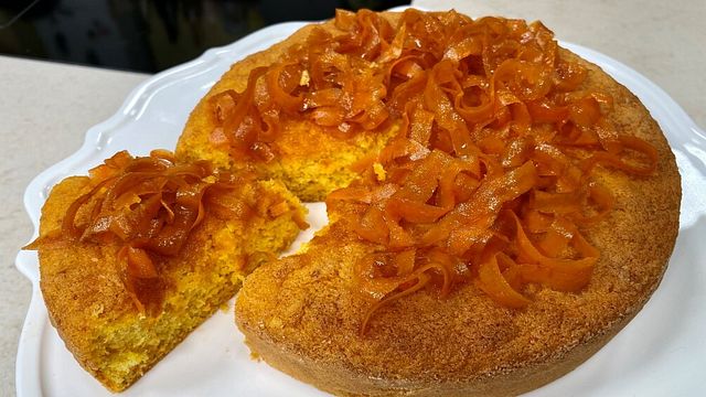 Versate il tutto nella teglia e infornate a 185° C per 25/ 30 minuti. Utilizzate le bucce di carota che dopo aver riposato nello sciroppo si sono raffreddate e diventate traslucide. Una volta sfornata la torta, appoggiatele sulla superficie come decorazione finale.
