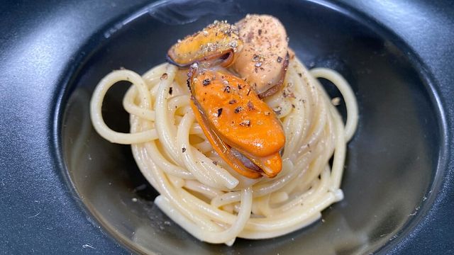 Mettete in padella l'olio, 1 spicchio di aglio e 1 chilo di cozze. Coprite con un coperchio e lasciate cuocere fino all'apertura delle cozze. Filtrate il sughetto che nel frattempo si è formato e sgusciate le cozze. Per due persone fate cuocere 200 grammi di spaghetti in acqua non salata. In una padella senza grassi tostate il pepe macinato al momento, aggiungete metà acqua delle cozze e lasciate ridurre.