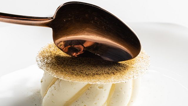 Per la cialda cristallina: portare a 165°. Una volta cotto stendere sul silpat e lasciare raffreddare. Una volta raffreddato, macinare, formare e passare al forno statico 3 minuti a 200°.