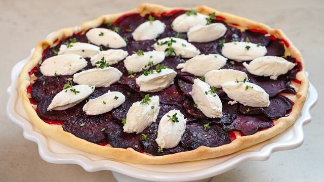 Tagliate a fettine sottili 300 grammi di barbabietole cotte. Mettete una sfoglia di pasta brisée rotonda in una teglia dai bordi bassi e adagiate le fettine di barbabietola. Condite con olio Evo, sale e infornate a 180 gradi per 30 minuti.