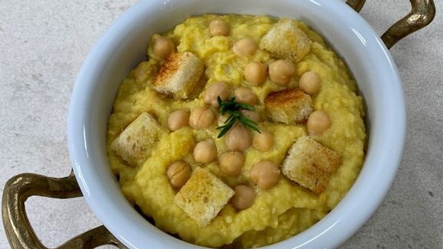 Nel frattempo preparate del pane, tagliatelo a dadini e condite poi con olio e sale e rendete croccante in forno o in padella. Salate alla fine. Aggiungete alle patate 300 grammi di ceci già cotti, fate cuocere qualche minuto e frullate. Se vi piace aggiungete del curry. Ultimate l'impiattamento con ceci interi, il pane che avete reso croccante e un filo di olio Evo.