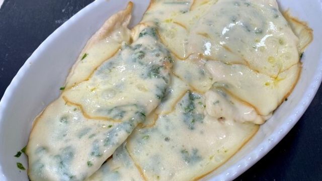 Lavate, tamponate il prezzemolo e tritatelo. Spennellate d'olio una pirofila, adagiatevi le fettine di pollo, aromatizzate con il prezzemolo, e ricoprite con le fettine di scamorza. Infornate a 200°C per circa 10 minuti. Sfornate quando la scamorza si sarà sciolta. Trasferite il pollo in camicia in un piatto da portata e servitelo filante.