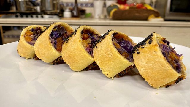 Una volta che il composto si sarà amalgamato, trasferitelo su di un piano ed iniziate ad impastarlo. Una volta ricavato un panetto, tiratelo con un mattarello fino ad ottenere un foglio con uno spessore di circa 3 mm. Distribuite la farcia e arrotolate creando un filone, chiudete bene i bordi avvolgendo le sponde esterne di pasta. Spennellate con acqua ed olio e cospargete i semini, infornate per 35 min a 180° gradi.