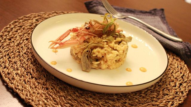 In una padella fate scaldare una noce di burro, aggiungete gli scampi tagliati a pezzetti, un cucchiaio di brodo di carciofi e per ultimo i quattro scampi tenuti interi. Cuocete per 1 minuto. In una padella ampia tostate il riso, aggiungete un pizzico di sale e bagnate con il brodo di carciofi. Dopo circa 15 minuti aggiungete la crema di scampi, i carciofi e i gambi cotti in precedenza. Quando sarà quasi cotto aggiungete la spadellata di scampi, togliete dal fuoco aggiustate di sale.