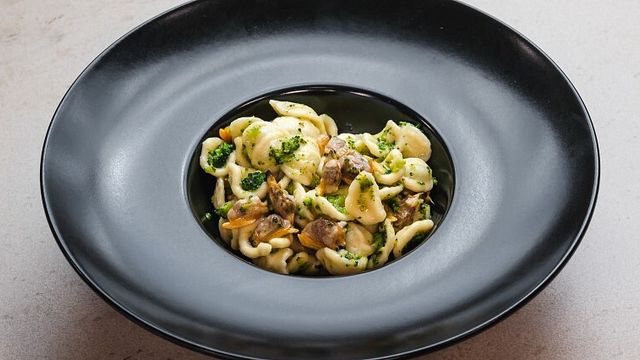 Una volta pronte le vongole, sgusciatele e filtrate l'acqua di cottura. Mettete a cuocere 200 grammi di orecchiette per due persone, con poco sale. Aggiungete poca acqua di cottura delle vongole ai broccoli, unite le orecchiette e saltatele con olio e mantecate.