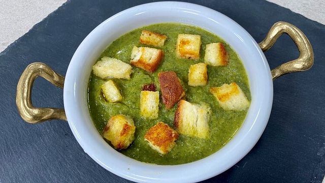 Aggiungete la cipolla e la patata del brodo. Appena le patate sono pronte, frullate. Tagliate delle fette di pane raffermo, mettete dell'olio e 1 spicchio di aglio in padella. Fate sciogliere 1 acciuga e rendete croccante il pane. Dopo aver frullato, impiattate la crema aggiungendo il pane di riciclo croccante.