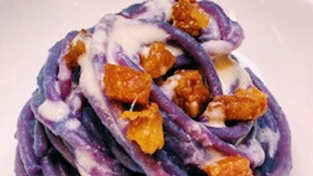 Se volete un'idea diversa per portare sulla tavola delle Feste un piatto goloso, d'impatto e di facile realizzazione, provate gli spaghettoni viola fonduta e guanciale. In una soluzione unica avrete colore, la croccantezza del guanciale e la morbida golosità della fonduta.