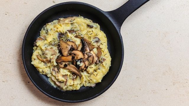 In una pentola scaldate 250 ml di latte. Schiacciate le patate, aggiungete 20 grammi di formaggio grattugiato e versate a filo il latte mescolando sul fuoco. Per ottenere la giusta morbidezza, potete aggiungere a piacere del burro. Incorporate i funghi. Per la decorazione finale, lasciatene da parte qualcuno più grande. Prima di portare in tavola aggiungete ancora timo.