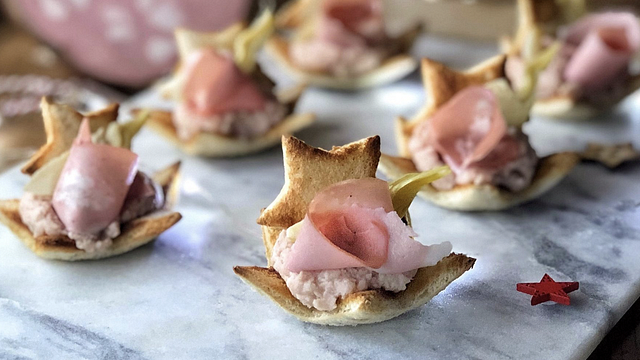 Farcite le tartine per aperitivo con la mousse di Mortadella e decorate con uno spicchio di carciofino, una stellina di pancarrè e un ricciolo di Mortadella Bologna IGP.