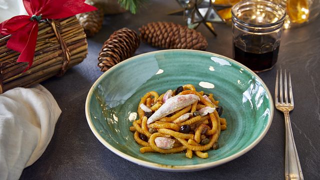 Io li compro spesso già pronti perchè tengono meglio la cottura. La versione asciutta è molto versatile perchè si può usare il sugo preferito e variarlo secondo la stagione. Per preparare il sugo ho usato le triglie, un pesce azzurro sano e gustoso, a cui ho aggiunto un trito di capperi ed olive taggiasche. I passatelli sono ottimi anche con sughi di verdura, in inverno si possono servire con un buon sugo di funghi trifolati, cubetti di zucca e rosmarino.