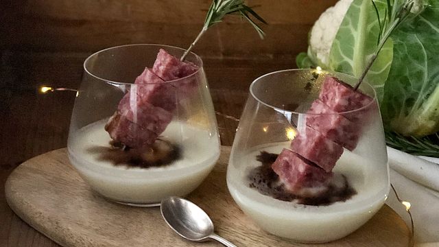 Un primo piatto caldo e avvolgente: una vellutata di cavolfiore perfetta per la stagione invernale arricchita dal gusto intenso del cotechino e dalla dolcezza dell’aceto balsamico. Una ricetta ricca di contrasti: la dolcezza della vellutata di cavolfiore e la nota saporita del cotechino, il profumo del rosmarino, ed il contrasto dell’aceto balsamico aggiunto alla fine. Un vero comfort food per la stagione fredda.