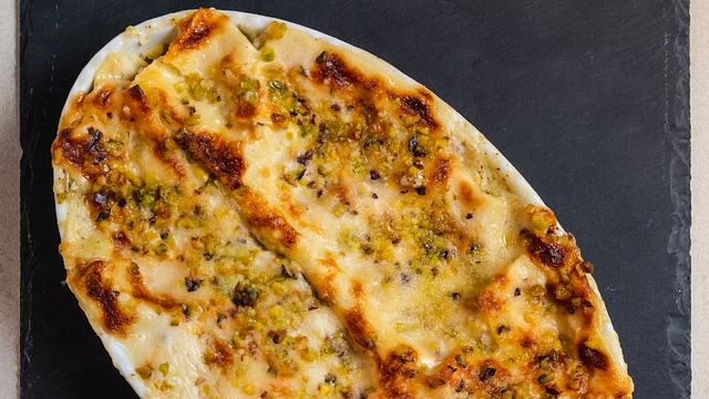 Tritate l’aglio spellato con un mixer insieme ai pistacchi sgusciati. Spegnete, aggiungete l'olio a filo, il Parmigiano Reggiano grattugiato, il basilico e regolate di sale. Azionate il mixer fino a rendere il composto cremoso. Trasferite il pesto in una terrina e mettetelo da parte. Eliminate la crosta dal taleggio e riducetelo in cubetti. Scaldate la besciamella in un pentolino, aggiungete il taleggio, un pizzico di noce moscata e amalgamate per sciogliere il formaggio. Spegnete e fate intiepidire. Sbollentate poco alla volta i fogli di lasagna in una pentola con acqua bollente salata, poi prelevateli con una schiumarola e metteteli ad asciugare su un canovaccio pulito.