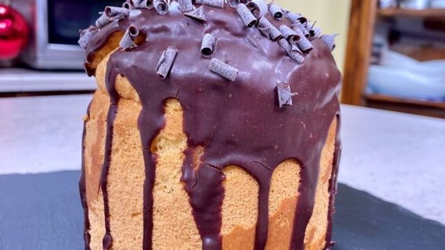 Dividete la quantità in due recipienti. Preparate il panettone aprendo il fondo. Montate solo una delle due ganache e farcite il panettone. L'altra colatela sul panettone e terminate decorando con granella o riccioli di cioccolato.