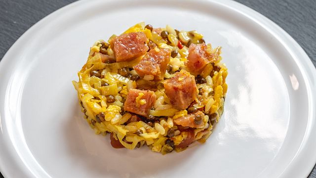 Strapazzate a parte 2 uova. Rimettete il porro con le lenticchie sul fuoco, aggiungete un po' di curcuma. Appena arrivato a temperatura, aggiungete il riso lessato e rendetelo croccante. Dopo qualche minuto unite il cotechino e infine le uova strapazzate. Impiattate usando un coppapasta creando una simpatica tartare da servire in tavola.