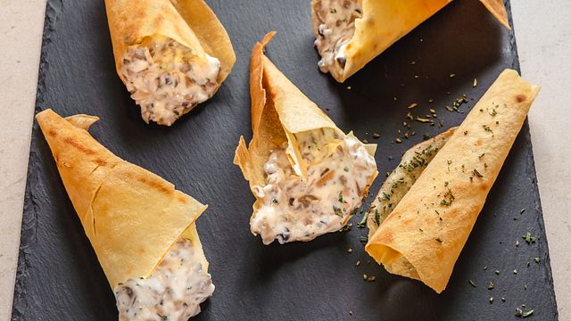 Con una mezzaluna tritate grossolanamente i funghi e amalgamateli con lo stracchino. Farcite i coni di carasau fritto. Potrete a seconda della stagione e della vostra fantasia, variare il ripieno e provare nuovi abbinamenti.