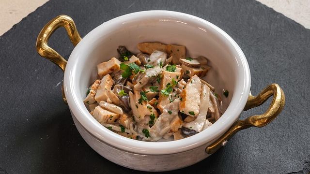 Pulite e tagliate 300 grammi di funghi. Mettete in una padella dell'olio Evo e 1 spicchio di aglio, aggiungete i funghi e cuocete a fuoco alto. Aggiungete 200 ml di panna vegetale e 100 ml di latte di riso o latte di soia.