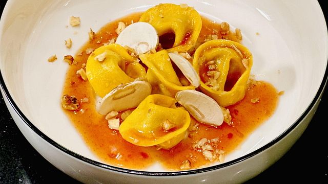 Un tortello che riscalda il cuore in una giornata di freddo inverno. Per la pasta la chef ha optato per un trenta tuorli, la sua preferita, perfetta per un ripieno deciso come questo. E poi è quella che faceva suo papà.
